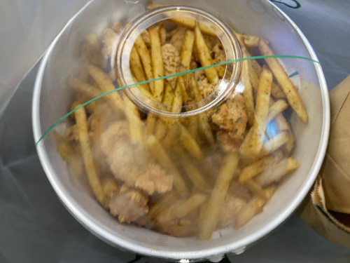 호치킨 메가순살의 포장은 아래 사진처럼 큰 상자에 순살치킨과 함께 감자튀김이 함께 들어가 있었습니다.